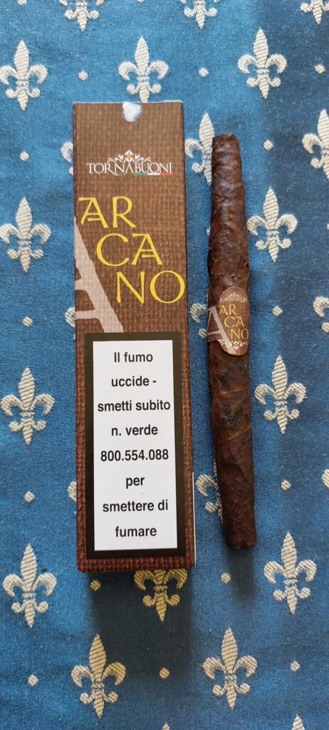 Fa parte della produzione regolare della serie Tornabuoni. La caratteristica particolare di questo “toscano” è quella di essere il primo sigaro “Fumé” della casa. Al termine della fase agricola della coltivazione del Kentucky (cura a fuoco, fermentazione e lunga stagionatura), dopo la battitura delle foglie e prima della lavorazione manifatturiera, i tabacchi selezionati per la miscela del Tornabuoni Arcano, vengono sottoposti ad un innovativo processo di affumicatura supplementare che conferisce al sigaro un carattere unico. In altre parole una doppia affumicatura. Vediamo le caratteristiche tecniche del Tornabuoni Arcano (testato su due scatolette, 4 pezzi). Lunghezza 15,5 cm precisi per un peso che oscilla tra i 10 e gli 11,4 grammi. Forma bitroncoconica classica. Lavorazione a macchina con utilizzo di macchinari storici risalenti al secolo scorso. La fascia è Kentucky della Valtiberina Fumé. Il ripieno è short filler (trinciato) ed è sempre Kentucky della Valtiberina Fumé. La fermentazione è di tipo tradizionale. La stagionatura del sigaro (maturazione) è lenta e naturale, di almeno 9 mesi. Confezione in astuccio marrone contenente due sigari con cellophane. Sulla scatoletta sono riportate le seguenti indicazioni: “Dopo la tradizionale cura a fuoco, il miglior tabacco nero della Valtiberina riposa a lungo e viene poi sottoposto a un ulteriore processo di affumicatura, per il quale impieghiamo solo i legni nobili dei generosi boschi del territorio. Nasce così il Tornabuoni Arcano, il nostro primo sigaro Fumé. Innovazione nel rispetto della tradizione toscana”. Prezzo medio, ma accessibile.